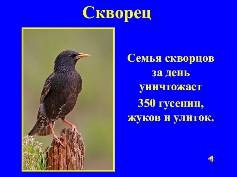 Скворец Семья скворцов за день уничтожает 350 гусениц, жуков и улиток.