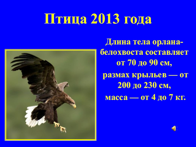 Птица 2013 годаДлина тела орлана-белохвоста составляет от 70 до 90 см, размах крыльев — от 200 до