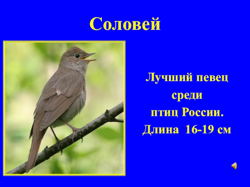 Соловей Лучший певецсреди птиц России. Длина 16-19 см