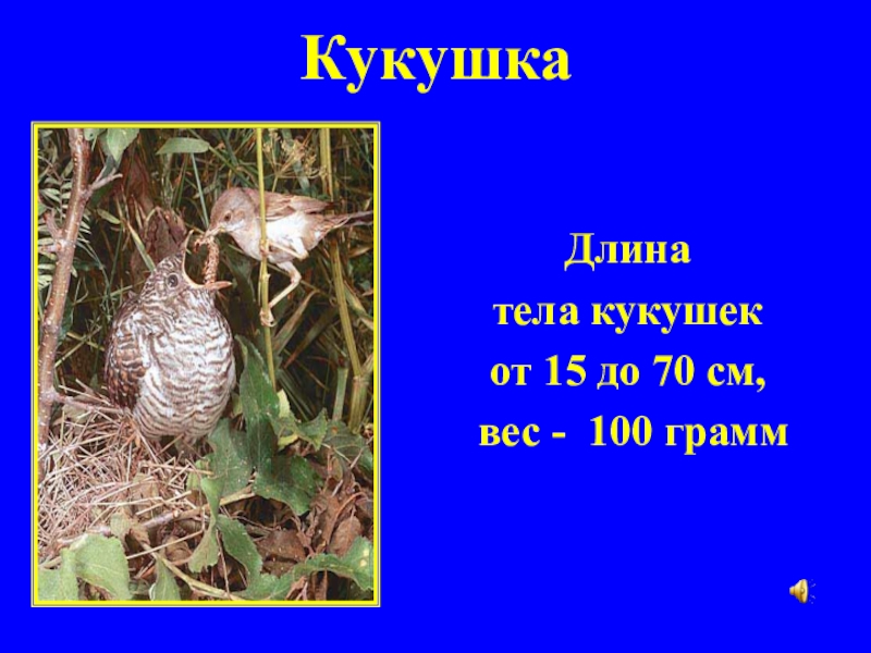 Кукушка Длина тела кукушек от 15 до 70 см, вес - 100 грамм