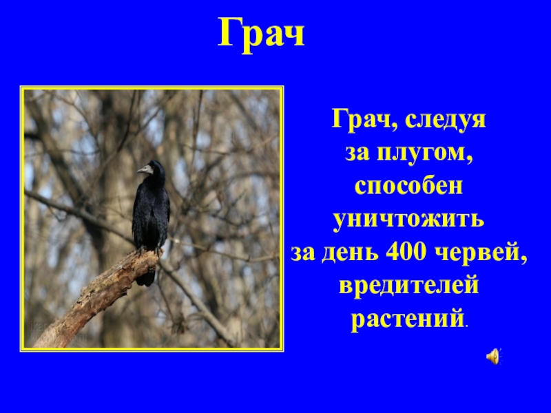 Слайд 8Грач, следуя за плугом, способен уничтожить за день 400 червей, вредителей
