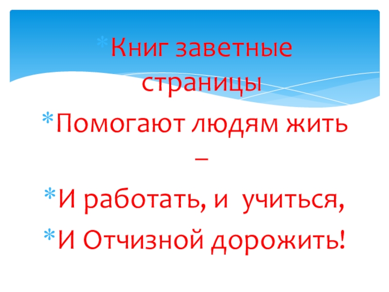 Книг заветные страницыПомогают людям жить –И работать, и учиться,И Отчизной дорожить!