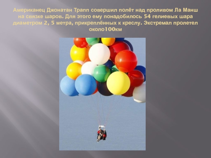 шаров. Для этого ему понадобилось 54 гелиевых шара диаметром 2, 5 метра, прикреплённых к креслу. Экстремал пролетел около100км