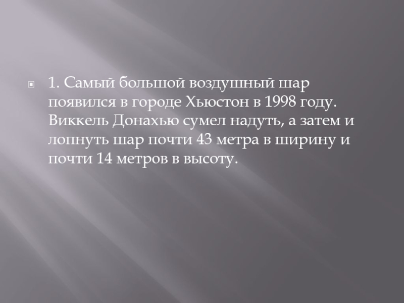 Слайд 221. Самый большой воздушный шар появился в городе Хьюстон в 1998