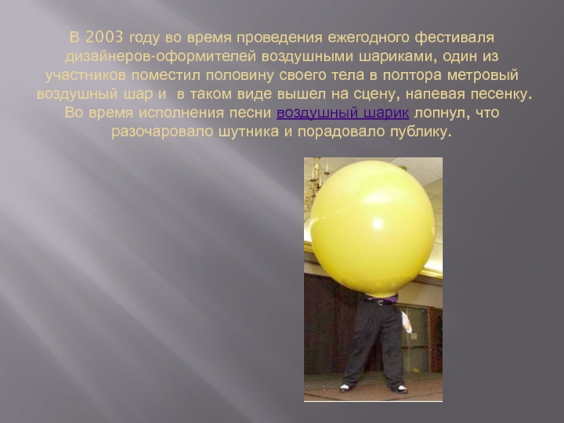 Слайд 18В 2003 году во время проведения ежегодного фестиваля дизайнеров-оформителей воздушными шариками,