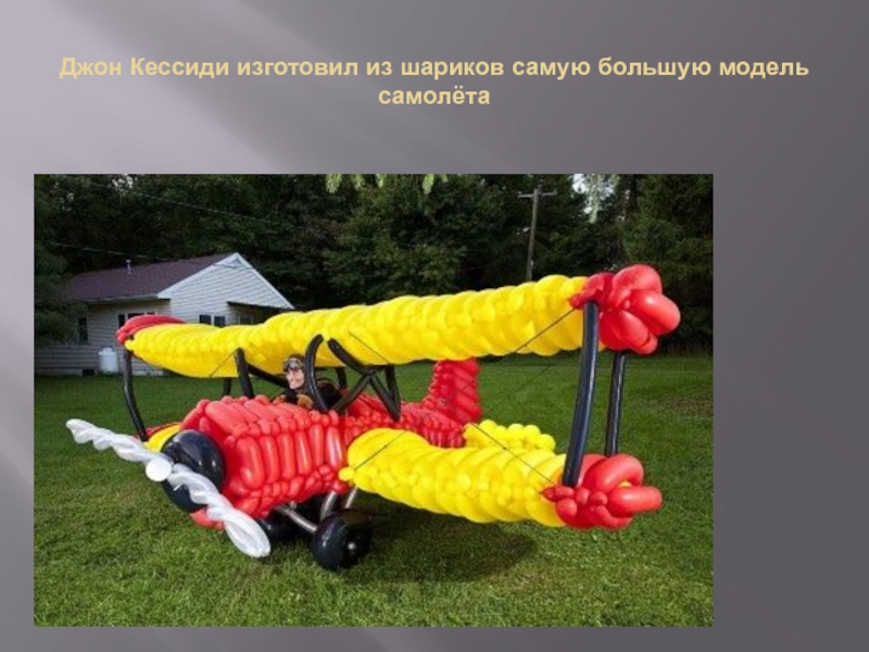 Слайд 20Джон Кессиди изготовил из шариков самую большую модель самолёта