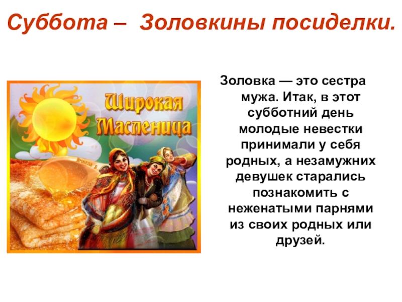 Слайд 9Суббота – Золовкины посиделки.
