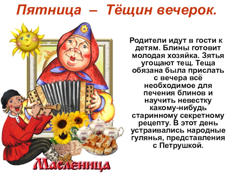 Слайд 8Пятница – Тёщин вечерок.