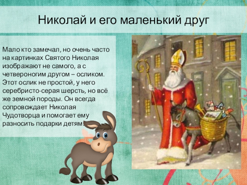 картинках Святого Николая изображают не самого, а с четвероногим другом – осликом. Этот ослик не простой, у него серебристо-серая шерсть, но всё же земной породы. Он всегда сопровождает Николая Чудотворца и помогает ему разносить подарки детям.