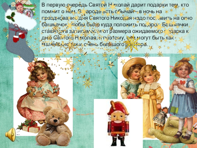 Слайд 6В первую очередь Святой Николай дарит подарки тем, кто помнит о