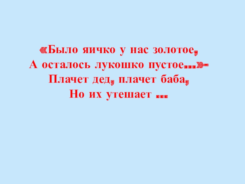 «Было яичко у нас золотое, А осталось лукошко пустое…»- Плачет дед, плачет баба, Но их утешает …