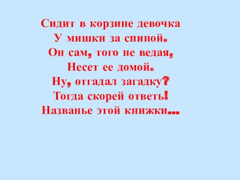 ее домой. Ну, отгадал загадку? Тогда скорей ответь! Названье этой книжки…