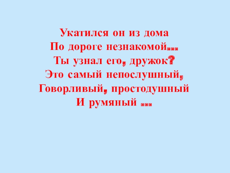 Укатился он из дома По дороге незнакомой… Ты узнал его, дружок? Это самый непослушный, Говорливый, простодушный И