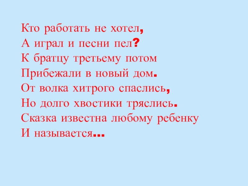 Кто работать не хотел, А играл и песни пел? К братцу третьему потом Прибежали в новый дом.