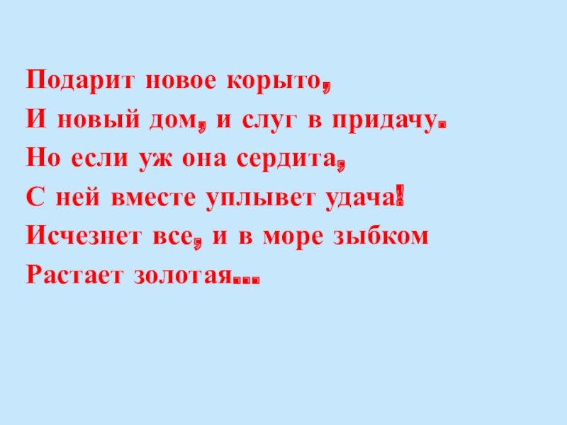 Подарит новое корыто, И новый дом, и слуг в придачу. Но если уж она сердита, С ней