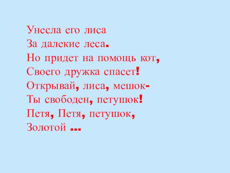 Слайд 7Унесла его лиса За далекие леса. Но придет на помощь кот, Своего дружка спасет! Открывай,