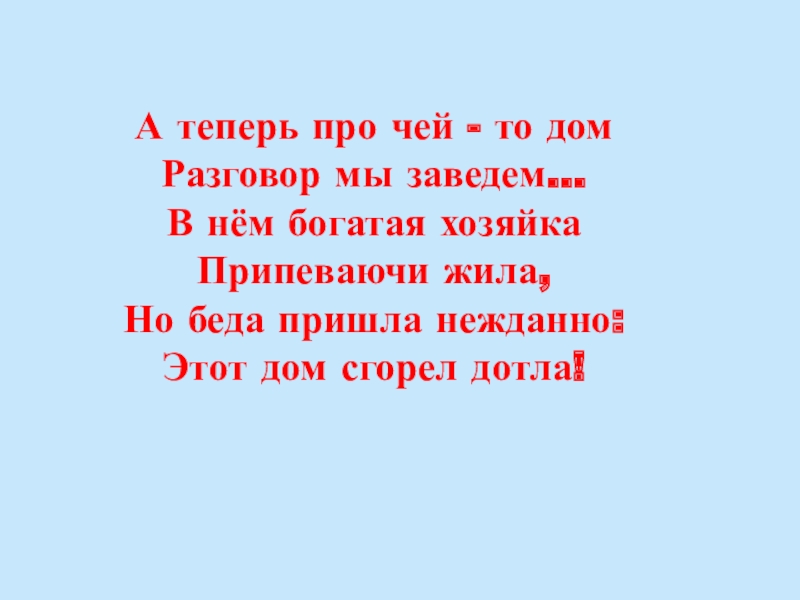 А теперь про чей - то дом Разговор мы заведем… В нём богатая хозяйка Припеваючи жила, Но
