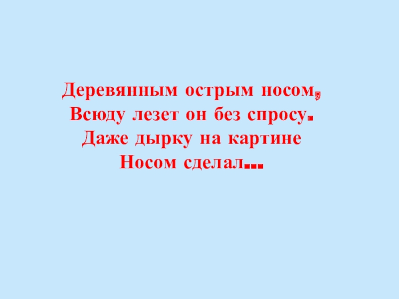 Деревянным острым носом, Всюду лезет он без спросу. Даже дырку на картине Носом сделал…