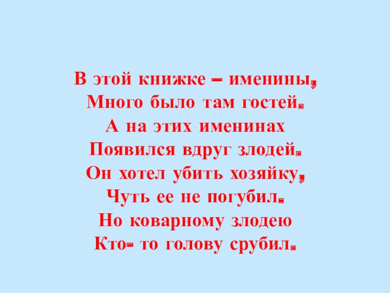 В этой книжке – именины, Много было там гостей. А на этих именинах Появился вдруг злодей. Он