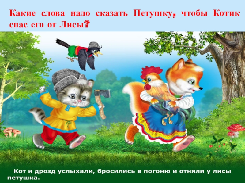 Слайд 40Какие слова надо сказать Петушку, чтобы Котик спас его от Лисы?