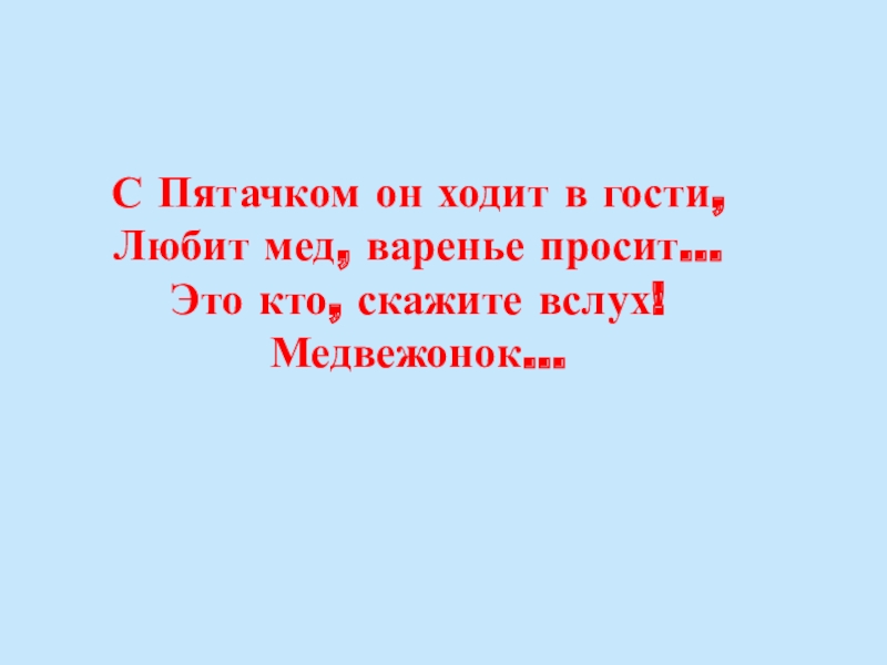 С Пятачком он ходит в гости, Любит мед, варенье просит… Это кто, скажите вслух! Медвежонок…