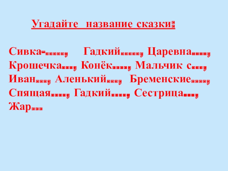 Угадайте название сказки:Сивка-…..,  Гадкий….., Царевна…., Крошечка…, Конёк…., Мальчик с…, Иван…, Аленький…, Бременские…., Спящая….,
