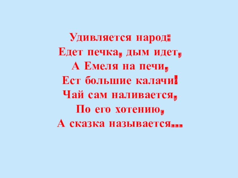 Удивляется народ: Едет печка, дым идет, А Емеля на печи, Ест большие калачи! Чай сам наливается, По