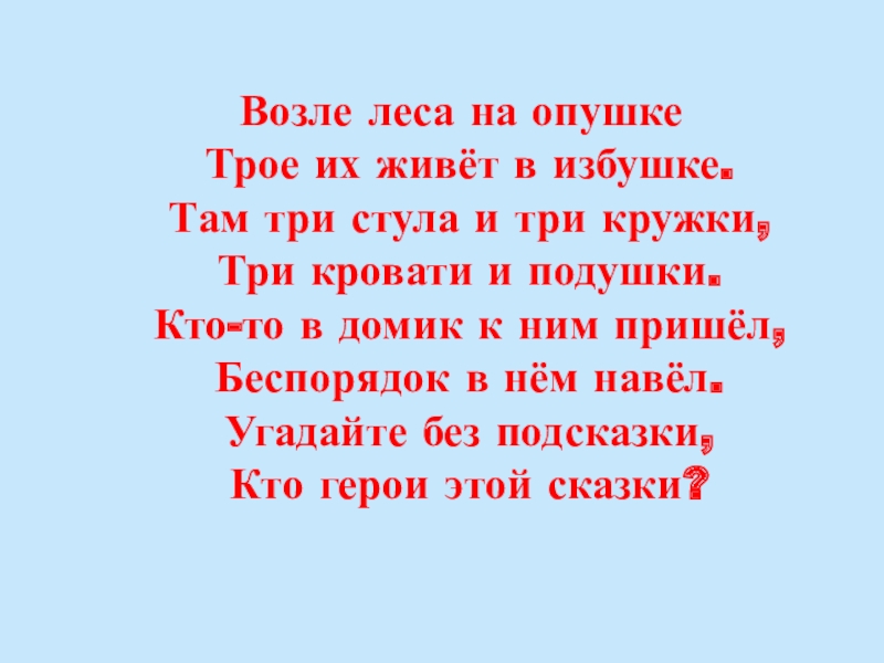 Возле леса на опушкеТрое их живёт в избушке.Там три стула и три кружки,Три кровати и подушки.Кто-то в