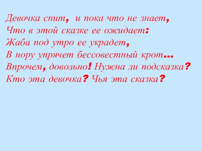 ожидает: Жаба под утро ее украдет, В нору упрячет бессовестный крот… Впрочем, довольно! Нужна ли подсказка? Кто эта девочка? Чья эта сказка?