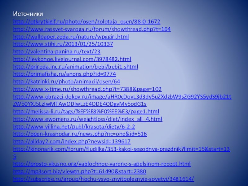 Источникиhttp://otkrytkigif.ru/photo/osen/zolotaja_osen/88-0-1672http://www.rassvet-svaroga.ru/forum/showthread.php?t=164http://wallpaper.zoda.ru/nature/wpggiri.htmlhttp://www.stihi.ru/2013/01/25/10337http://valentina-panina.ru/text/23http://levkonoe.livejournal.com/3978482.htmlhttp://priroda.inc.ru/animation/bebi/bebi1.shtmlhttp://primafisha.ru/anons.php?id=9774http://katrinki.ru/photo/animacii/osen/64http://www.x-time.ru/showthread.php?t=7388&page=102http://www.obrazci-dokov.ru/image/aHR0cDovL3d3dy5uZXdzbW9sZG92YS5ydS9jb21tZW50YXJ5LzIwMTAwODIwLzE4ODE4ODgyMy5odG1shttp://melissa-li.ru/tags/%EF%E8%F0%EE%E3/page1.htmlhttp://www.ewomens.ru/weightloss/diet/index_all_4.htmlhttp://www.villina.net/publ/krasota/diety/6-2-2http://open-krasnodar.ru/news.php?nc=one&id=516http://allday2.com/index.php?newsid=139617http://kinonarik.com/forum/fludilka/353-kakoj-segodnya-prazdnik?limit=15&start=135http://prosto-vkusno.org/yablochnoe-varene-s-apelsinom-recept.htmlhttp://mp3sort.biz/viewtn.php?t=61490&start=2380http://subscribe.ru/group/hochu-vsyo-znyitpoleznyie-sovetyi/3481614/