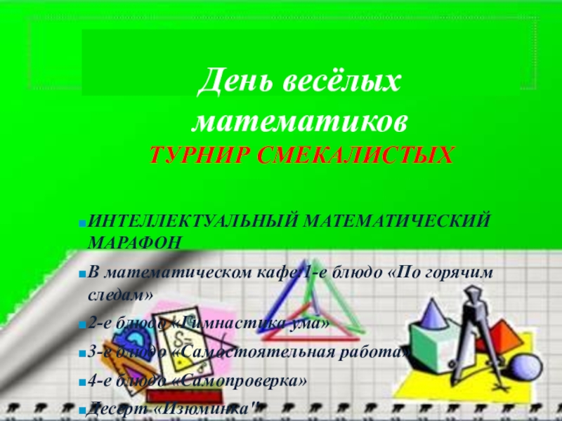 День весёлых математиковТУРНИР СМЕКАЛИСТЫХИНТЕЛЛЕКТУАЛЬНЫЙ МАТЕМАТИЧЕСКИЙ МАРАФОНВ математическом кафе:1-е блюдо «По горячим следам»2-е блюдо «Гимнастика ума»3-е блюдо «Самостоятельная
