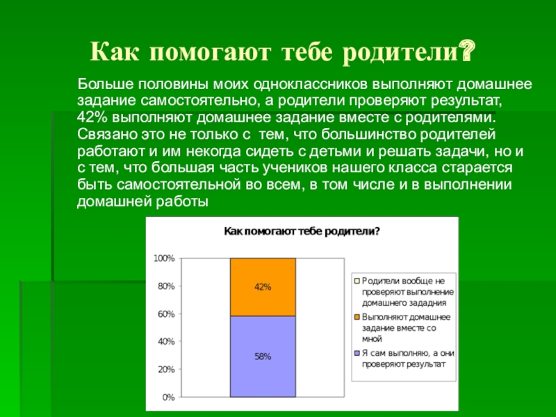 домашнее задание самостоятельно, а родители проверяют результат, 42% выполняют домашнее задание вместе с родителями. Связано это не только с тем, что большинство родителей работают и им некогда сидеть с детьми и решать задачи, но и с тем, что большая часть учеников нашего класса старается быть самостоятельной во всем, в том числе и в выполнении домашней работы