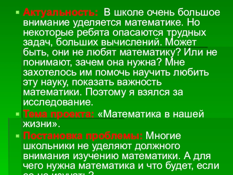 Слайд 2Актуальность: В школе очень большое внимание уделяется математике. Но некоторые ребята
