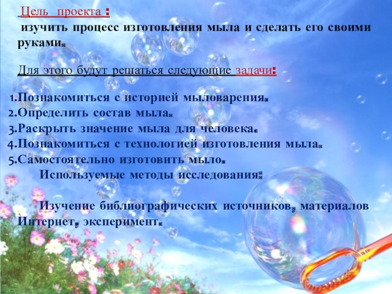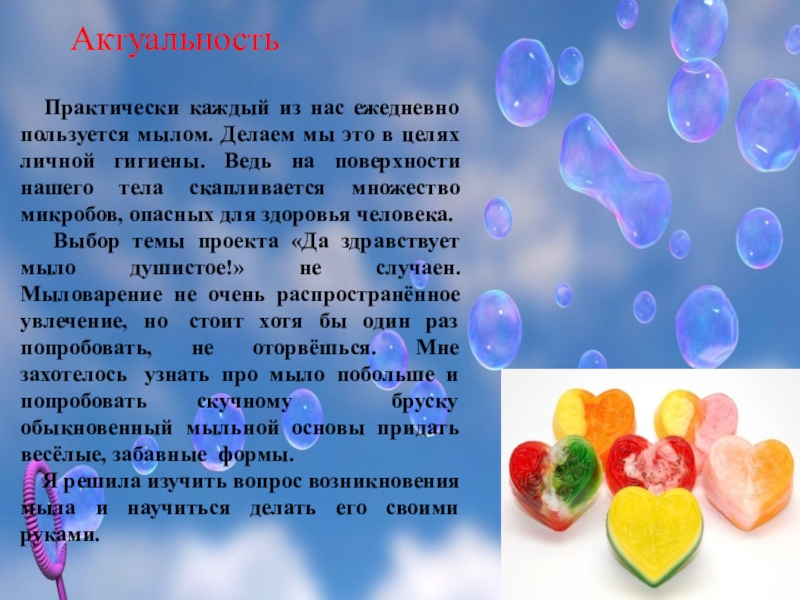 Выбор темы проекта «Да здравствует мыло душистое!» не случаен. Мыловарение не очень распространённое увлечение, но стоит хотя бы один раз попробовать, не оторвёшься. Мне захотелось узнать про мыло побольше и попробовать скучному бруску обыкновенный мыльной основы придать весёлые, забавные формы.