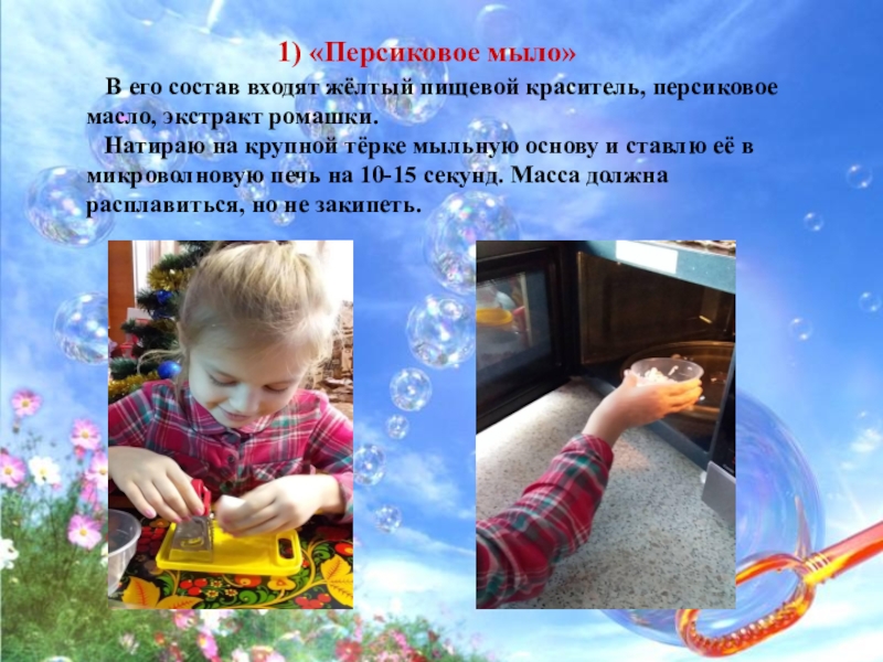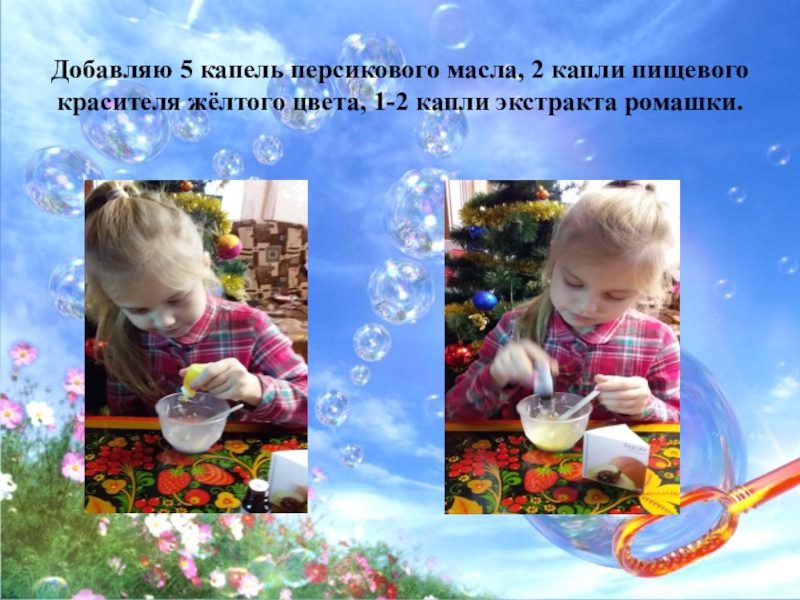 Слайд 10Добавляю 5 капель персикового масла, 2 капли пищевого красителя жёлтого цвета,