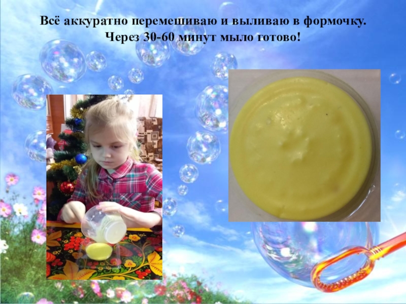 Слайд 11Всё аккуратно перемешиваю и выливаю в формочку. Через 30-60 минут мыло