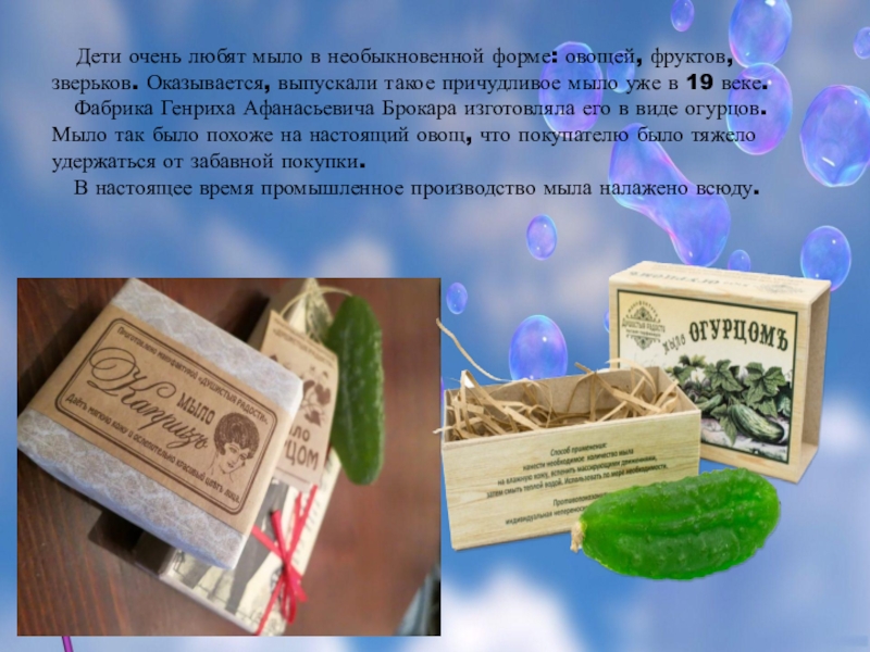 Фабрика Генриха Афанасьевича Брокара изготовляла его в виде огурцов. Мыло так было похоже на настоящий овощ, что покупателю было тяжело удержаться от забавной покупки.