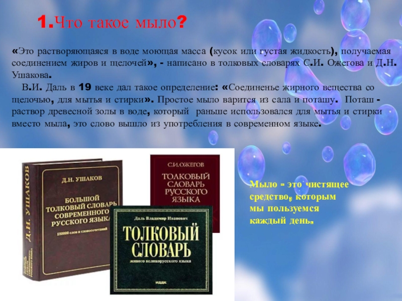 соединением жиров и щелочей», - написано в толковых словарях С.И. Ожегова и Д.Н. Ушакова.