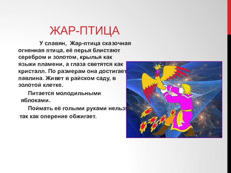 У славян, Жар-птица сказочная огненная птица, её перья блистают серебром и
