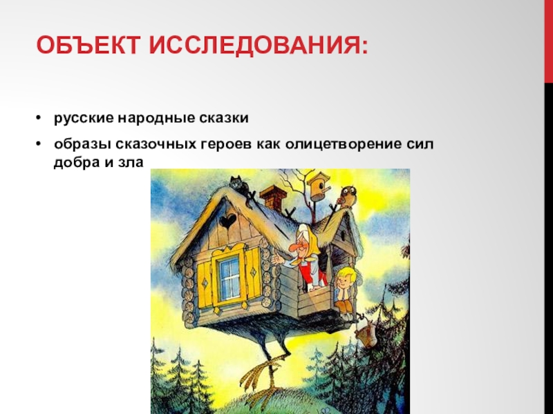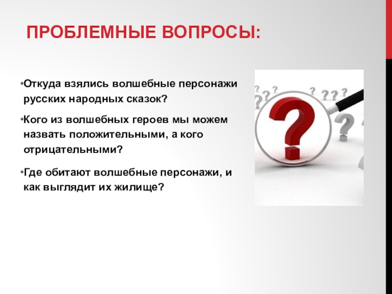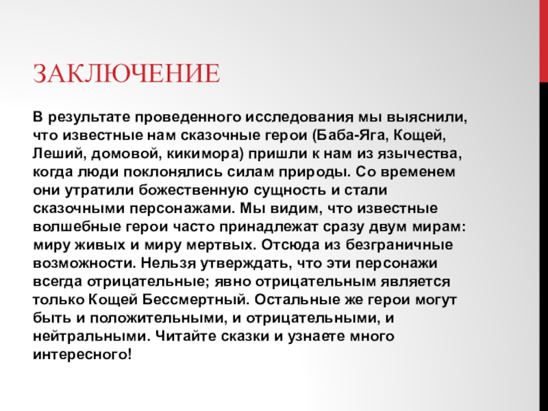 (Баба-Яга, Кощей, Леший, домовой, кикимора) пришли к нам из язычества, когда люди поклонялись силам природы. Со временем они утратили божественную сущность и стали сказочными персонажами. Мы видим, что известные волшебные герои часто принадлежат сразу двум мирам: миру живых и миру мертвых. Отсюда из безграничные возможности. Нельзя утверждать, что эти персонажи всегда отрицательные; явно отрицательным является только Кощей Бессмертный. Остальные же герои могут быть и положительными, и отрицательными, и нейтральными. Читайте сказки и узнаете много интересного!