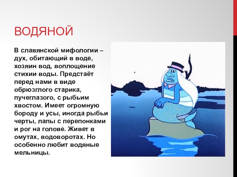 В славянской мифологии – дух, обитающий в воде, хозяин вод, воплощение