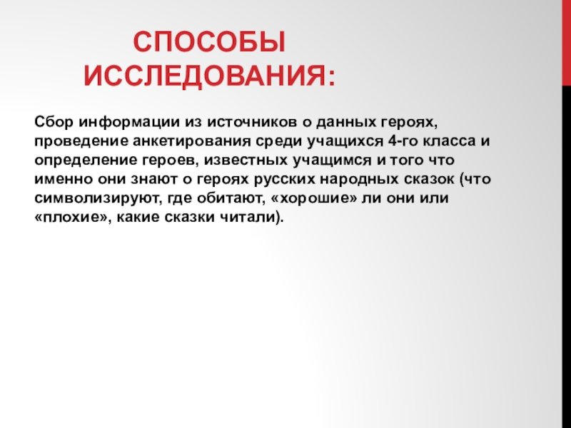 учащихся 4-го класса и определение героев, известных учащимся и того что именно они знают о героях русских народных сказок (что символизируют, где обитают, «хорошие» ли они или «плохие», какие сказки читали).