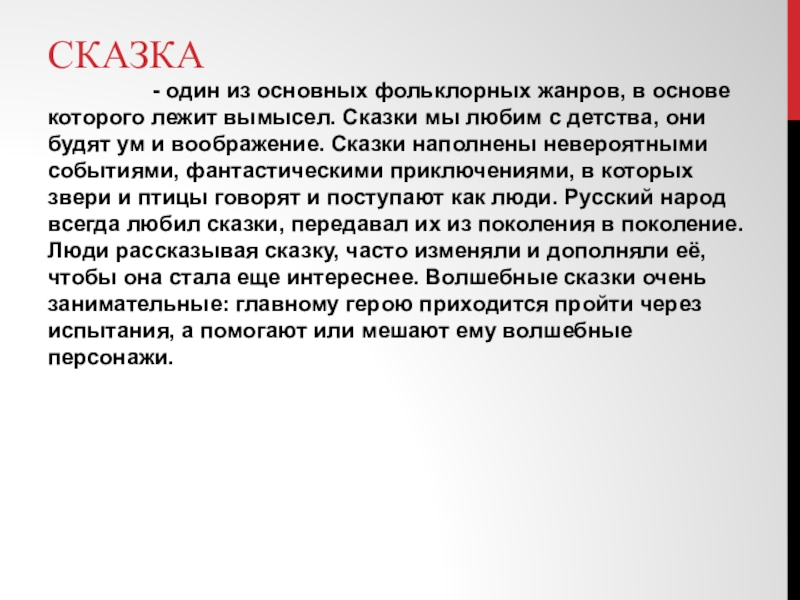 один из основных фольклорных жанров, в основе которого лежит вымысел. Сказки мы любим с детства, они будят ум и воображение. Сказки наполнены невероятными событиями, фантастическими приключениями, в которых звери и птицы говорят и поступают как люди. Русский народ всегда любил сказки, передавал их из поколения в поколение. Люди рассказывая сказку, часто изменяли и дополняли её, чтобы она стала еще интереснее. Волшебные сказки очень занимательные: главному герою приходится пройти через испытания, а помогают или мешают ему волшебные персонажи.