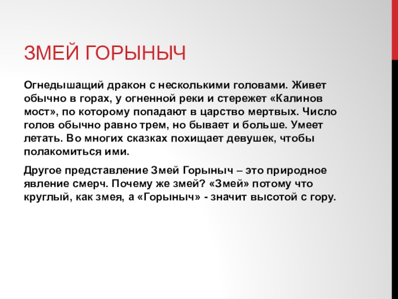 огненной реки и стережет «Калинов мост», по которому попадают в царство мертвых. Число голов обычно равно трем, но бывает и больше. Умеет летать. Во многих сказках похищает девушек, чтобы полакомиться ими.