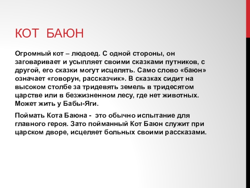 Поймать Кота Баюна - это обычно испытание для главного героя. Зато пойманный Кот Баюн служит при царском дворе, исцеляет больных своими рассказами.