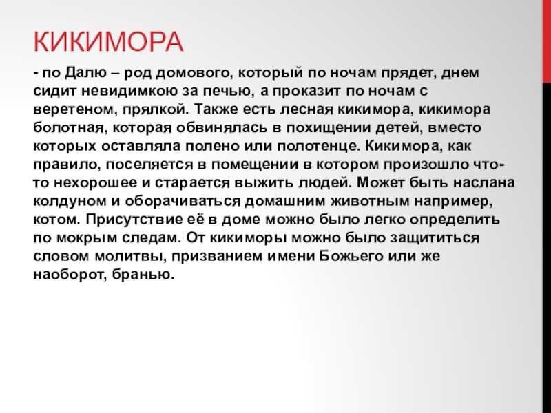 сидит невидимкою за печью, а проказит по ночам с веретеном, прялкой. Также есть лесная кикимора, кикимора болотная, которая обвинялась в похищении детей, вместо которых оставляла полено или полотенце. Кикимора, как правило, поселяется в помещении в котором произошло что-то нехорошее и старается выжить людей. Может быть наслана колдуном и оборачиваться домашним животным например, котом. Присутствие её в доме можно было легко определить по мокрым следам. От кикиморы можно было защититься словом молитвы, призванием имени Божьего или же наоборот, бранью.