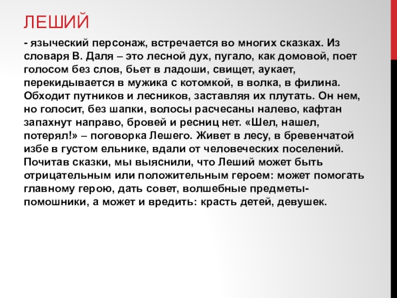 – это лесной дух, пугало, как домовой, поет голосом без слов, бьет в ладоши, свищет, аукает, перекидывается в мужика с котомкой, в волка, в филина. Обходит путников и лесников, заставляя их плутать. Он нем, но голосит, без шапки, волосы расчесаны налево, кафтан запахнут направо, бровей и ресниц нет. «Шел, нашел, потерял!» – поговорка Лешего. Живет в лесу, в бревенчатой избе в густом ельнике, вдали от человеческих поселений. Почитав сказки, мы выяснили, что Леший может быть отрицательным или положительным героем: может помогать главному герою, дать совет, волшебные предметы-помошники, а может и вредить: красть детей, девушек.