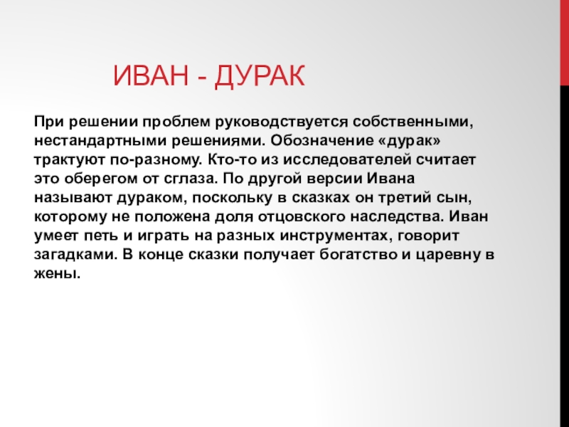 трактуют по-разному. Кто-то из исследователей считает это оберегом от сглаза. По другой версии Ивана называют дураком, поскольку в сказках он третий сын, которому не положена доля отцовского наследства. Иван умеет петь и играть на разных инструментах, говорит загадками. В конце сказки получает богатство и царевну в жены.