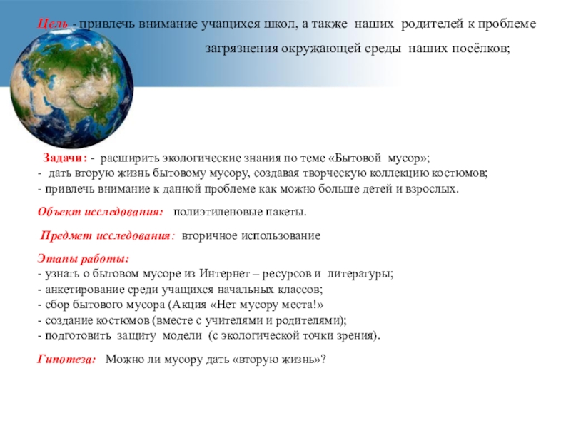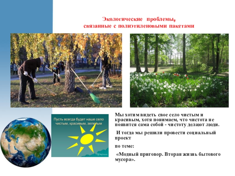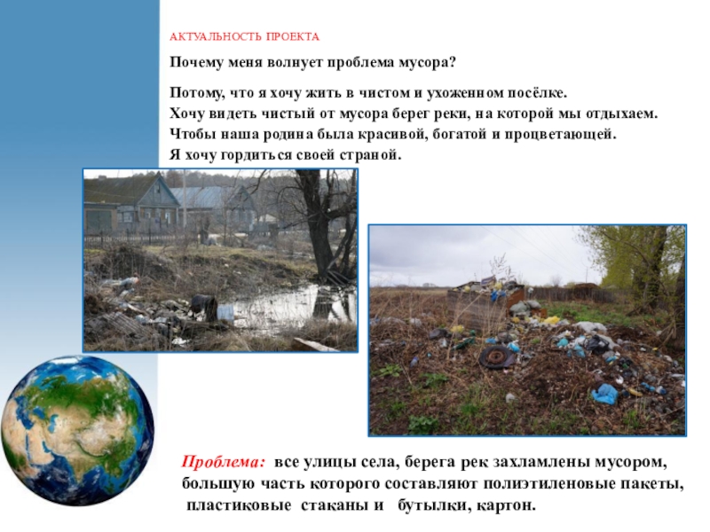 Проблема: все улицы села, берега рек захламлены мусором, большую часть которого составляют полиэтиленовые пакеты,