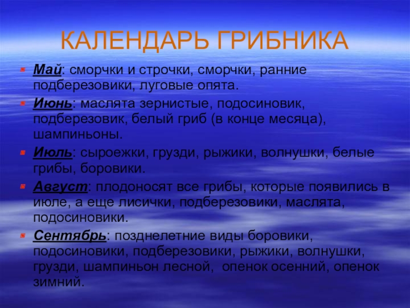 КАЛЕНДАРЬ ГРИБНИКАМай: сморчки и строчки, сморчки, ранние подберезовики, луговые опята.Июнь: маслята зернистые, подосиновик, подберезовик, белый гриб (в
